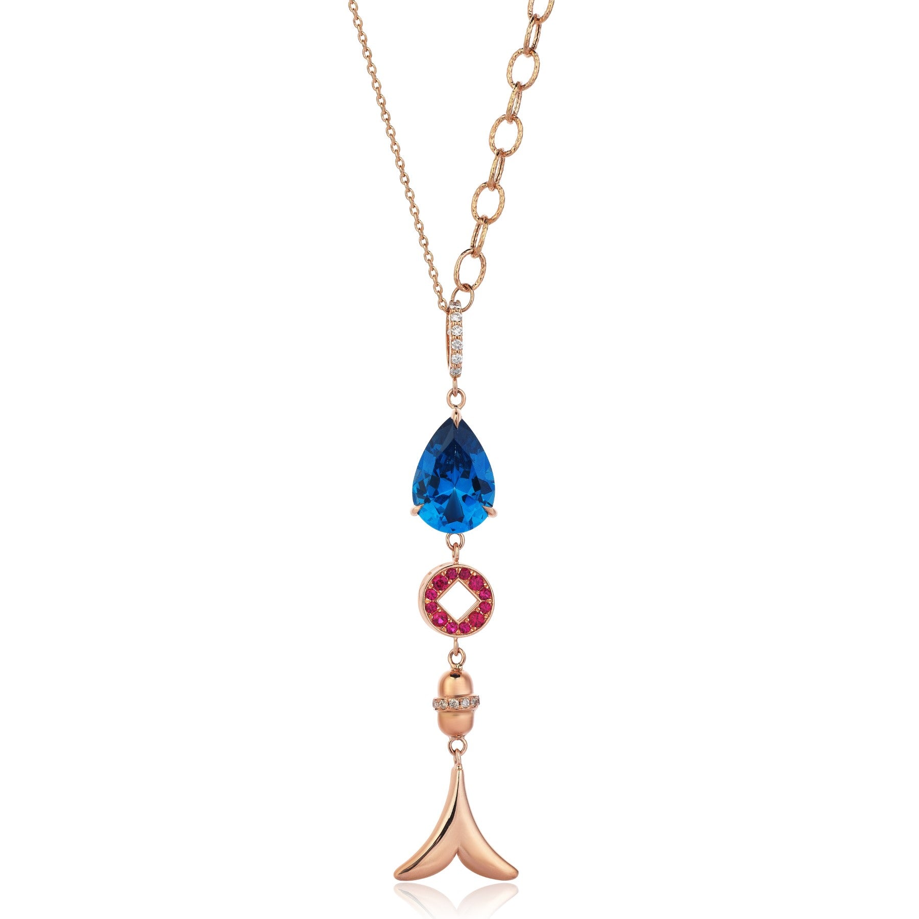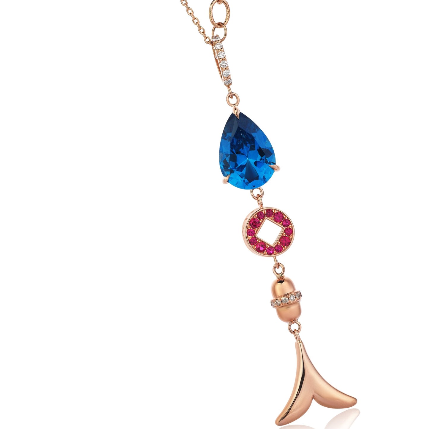 Our exquisite fish necklace, made of 14K gold and featuring brilliant cut diamonds, cognac diamonds, ruby, and a stunning 4.28CT pear cut blue topaz. This unique piece also carries Japanese money for good luck, making it a perfect addition to any collection. The perfect blend of luxury and luck with our fish necklace.