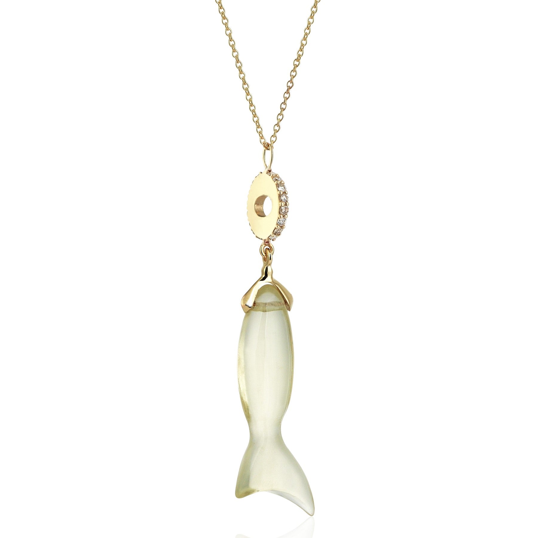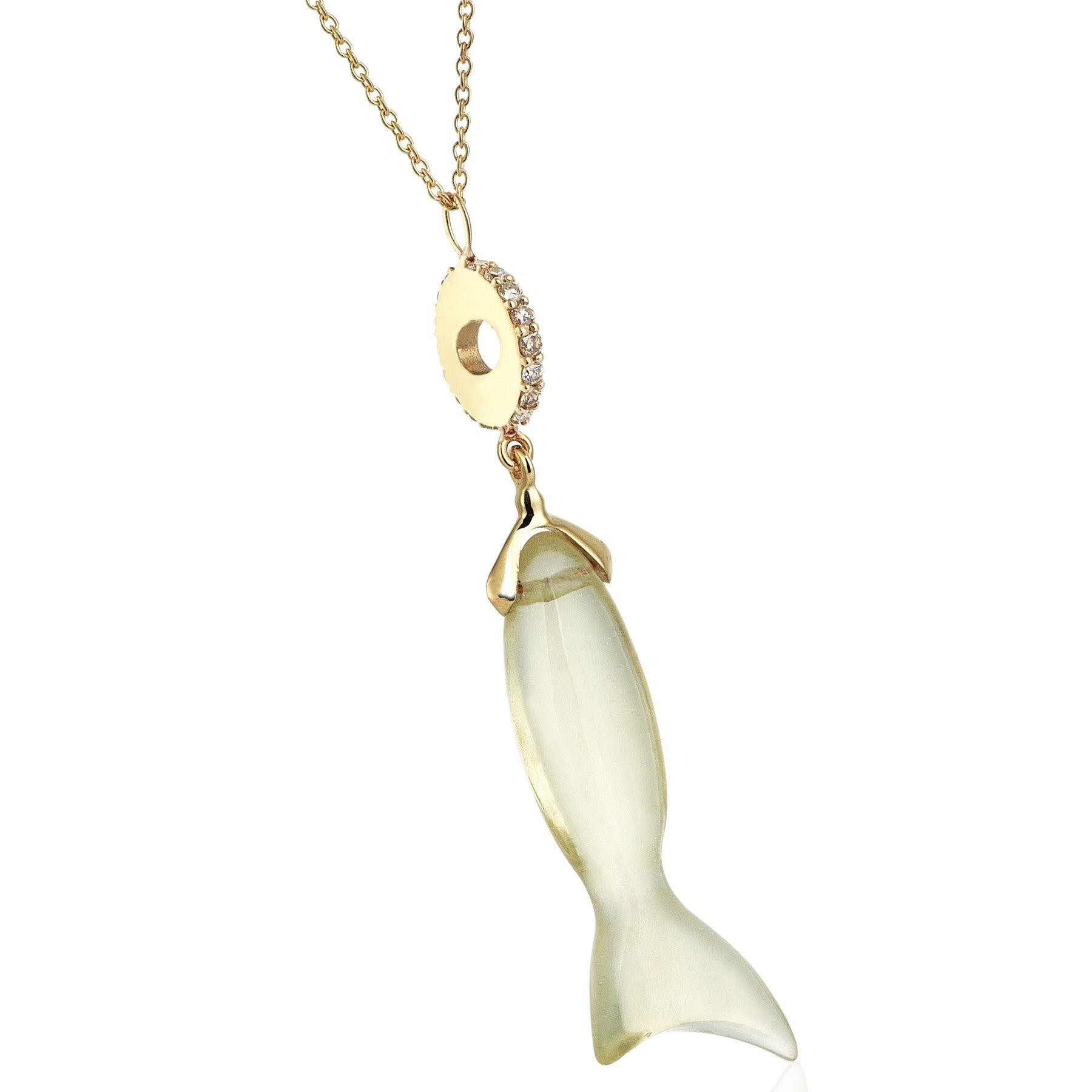 Introducing the Natural Citrine Fish Necklace, a radiant Wishes & Fishes treasure. Elegantly crafted in 14K gold, this striking piece boasts 16 Cognac Diamonds totaling 0.17 CT. Showcase its luminous beauty solo or pair with complementary necklaces for a truly captivating ensemble.