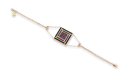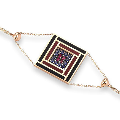 Ignite your style with the vibrant Square Enameled Bracelet from our Talismanic Symbols collection. Handcrafted in 14K rose gold, this captivating piece boasts a 21x21 mm motif embellished with 0.63 CT sapphires and 0.22 CT rubies, creating a stunning statement.