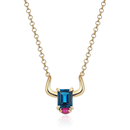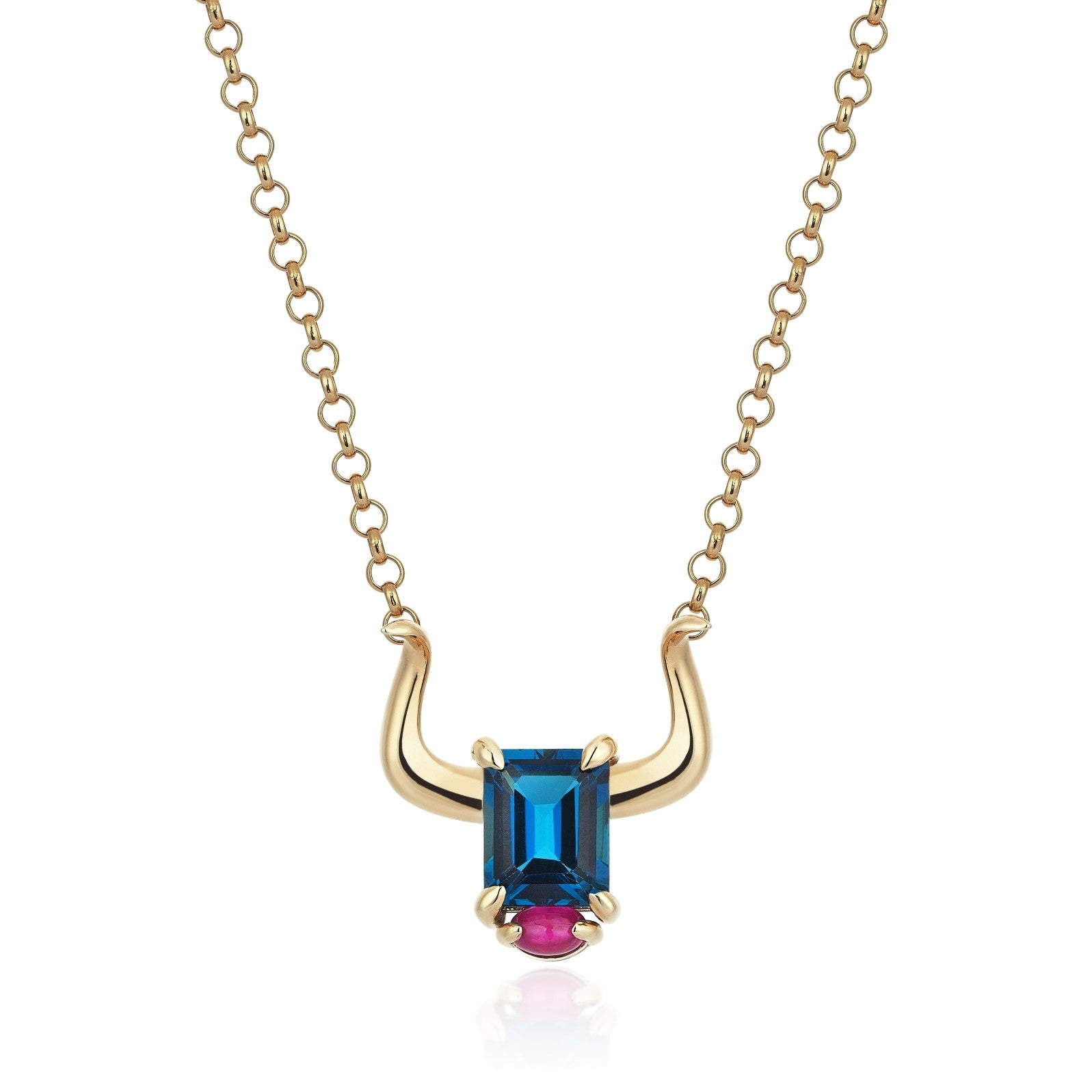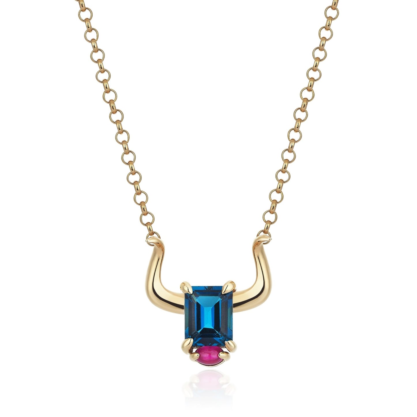 Unleash your inner Taurus with DIV's alluring Taurus Necklace, part of the Zodiac collection. The 14K Gold piece boasts 0.51 CT Natural Ruby and 6.65 CT Blue Topaz. Wear it alone or with other necklaces for a stunning celestial statement.