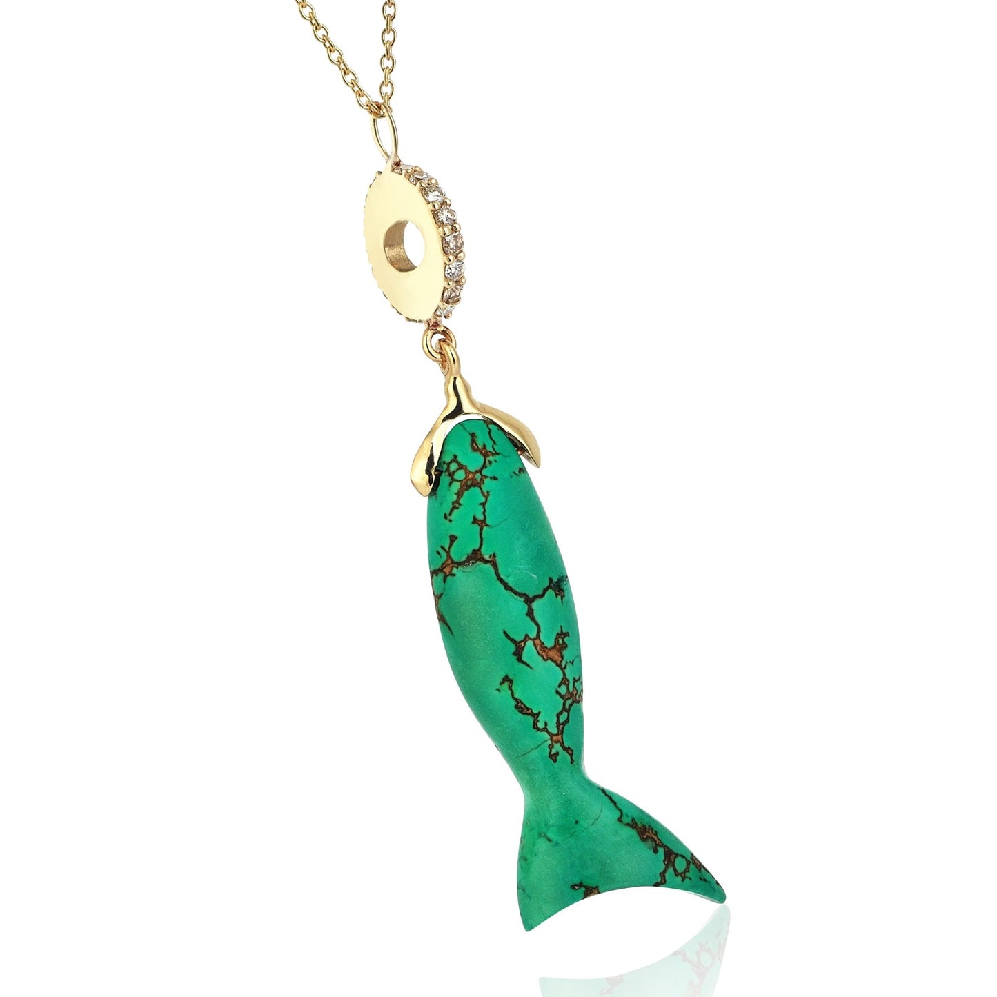 Dive into the allure of the Turquoise Fish Necklace, a mesmerizing addition to our Wishes & Fishes Collection. This captivating 14K gold necklace features 16 sparkling Cognac Diamonds totaling 0.17 CT. Wear it individually for an elegant statement or layer with other pieces for a sophisticated, eye-catching look.